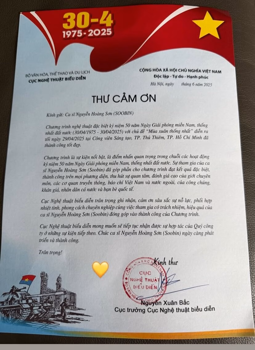 Cục Nghệ thuật vừa gửi thư cảm ơn đến ca sĩ Nguyễn Hoàng Sơn, hoạt động nghệ thuật với nghệ danh SOOBIN, vì những đóng góp thiết thực và quý giá trong Chương trình nghệ thuật đặc biệt kỷ niệm 50 năm Ngày Giải phóng miền Nam, thống nhất đất nước. Chương trình với chủ đề ‘Mùa xuân thống nhất’ đã được tổ chức vào tối ngày 29/04/2025, mang đến một không gian nghệ thuật đặc sắc và ý nghĩa.