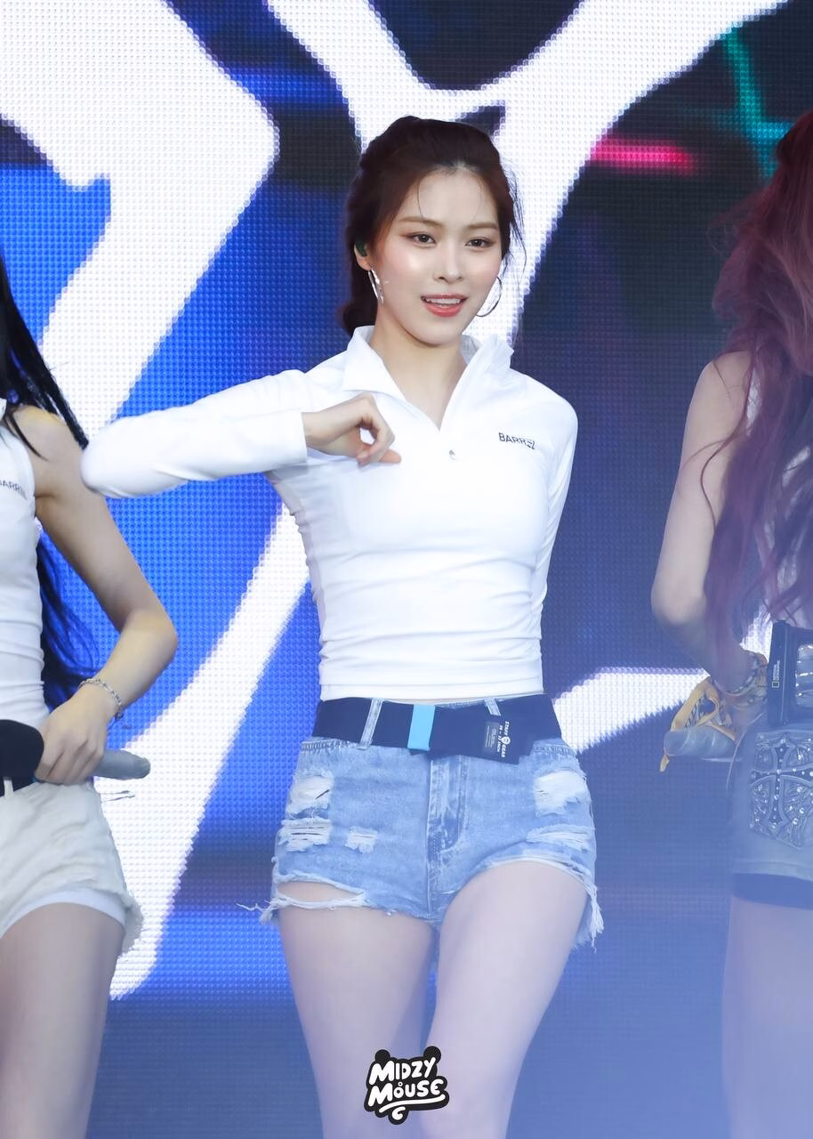 Cô diện một mẫu áo bơi dài tay màu trắng của thương hiệu Barrel, giúp tôn lên vòng eo nhỏ gọn và vóc dáng săn chắc của mình. Sự kết hợp với quần short jeans rách cạp cao và thắt lưng đen bản to đã tạo nên một phong cách năng động và thể thao, không cần phô diễn quá nhiều body nhưng vẫn khiến Ryujin trở nên nổi bật.