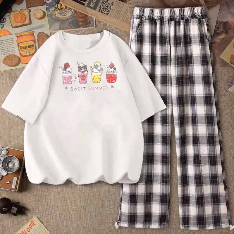 Áo in hình sinh động cho mùa hè – SÉT ÁO KÈM QUẦN KẺ IN HÌNH 4 CỐC SINH TỐ MÈO