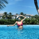 Cô đã khéo léo biến hóa phong cách với các thiết kế bikini khác biệt, mỗi set đều mang một sức hút riêng. Với bộ bikini chấm bi đen trắng, cô nàng chọn kiểu dáng hai mảnh đơn giản nhưng được nhấn nhá bằng viền ren và chân váy lưới xòe điệu đà. Ở những bức ảnh khác, “nữ hoàng dao kéo” khoe dáng trong thiết kế bikini màu nâu nude sang trọng.